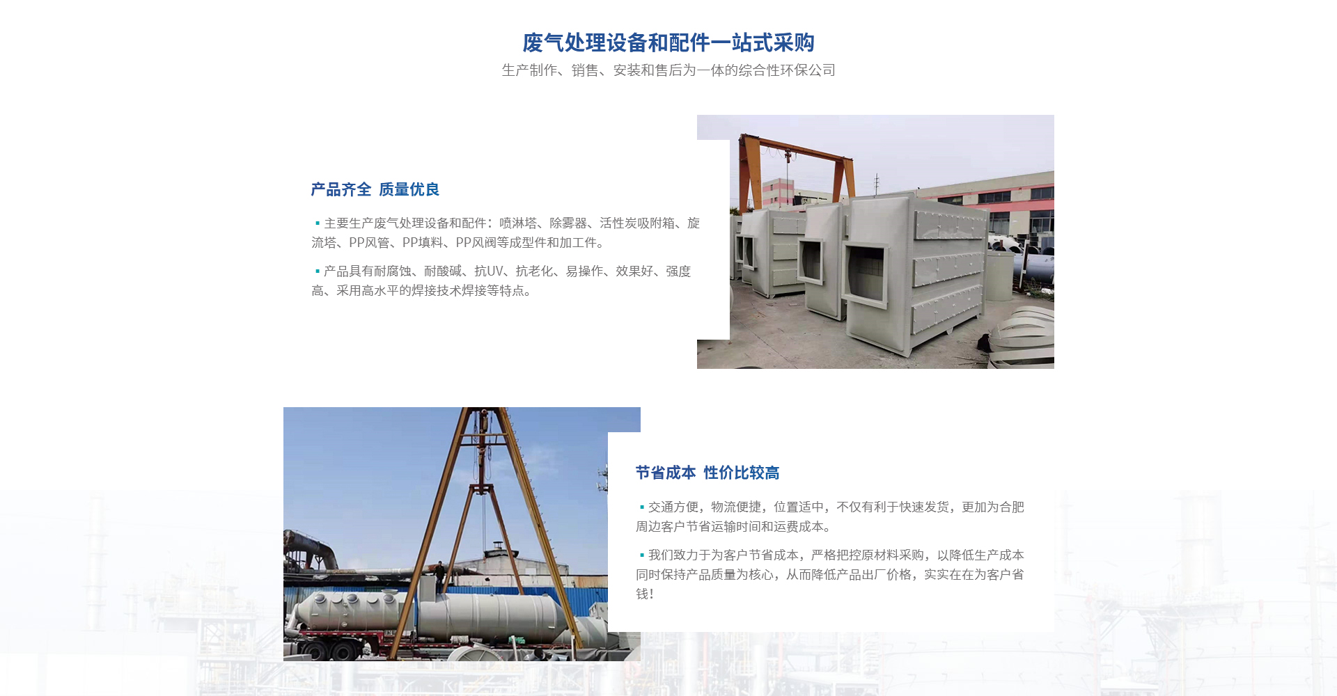 合肥熙誠環(huán)??萍加邢薰臼俏跽\環(huán)保合肥分公司,是一家集產(chǎn)品生產(chǎn)制作、銷售、安裝和售后為一體的綜合性環(huán)保公司。主要生產(chǎn)廢氣處理設(shè)備和配件:噴淋塔、除霧器、活性炭吸附箱、旋流塔、PP風(fēng)管、PP填料、PP風(fēng)閥等成型件和加工件,產(chǎn)品具有耐腐蝕、耐酸堿、抗UV、抗老化、易操作、效果好、強(qiáng)度高、采用高水平的焊接技術(shù)焊接等特點(diǎn);滿足客戶一站式采購的要求。廣泛應(yīng)用于電子業(yè)、化工業(yè)、醫(yī)藥業(yè)、紡織業(yè)、橡塑業(yè)、汽車業(yè)、...